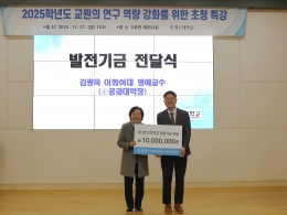 우리 대학 산학협력단은 11월 21일, 이화여자대학교의 김광옥 명예교수가 연구 씨드 머니(seed money) 조성을 위해 발전기금 일천만원을 기탁했다고 밝혔다. 이번 기탁은 연구자의 초기 연구 착수와 신진 연구의 활성화를 지원하기 위한 것으로, 해당 기금은 △신규 연구 아이디어 발굴 △학내 연구자 간 공동 연구 기반 조성 △...