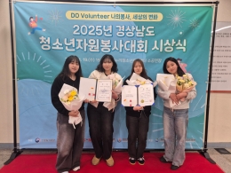 우리 대학 사회복지학과 학생들이 지난 11월 19일 우리누리 청소년문화센터에서 열린 ‘2025년 경상남도 청소년자원봉사대회 시상식’ 2개 부문에서 수상하는 영예를 안았다. 사회복지학과 재학생들로 구성된 ‘누리어스’팀은 청소년 동아리 부문에서 경상남도의회의장상을 수상했으며, 그 중 김서영·김민주·나정현·이하나 학생은 숏폼 영상 부문...