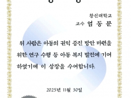 우리 대학 사회복지학과 염동문 교수(대학원장)가 지난 11월 30일 보건복지부로부터 보건복지부장관 표창(제34822호)을 수상했다. 이번 표창은 아동 복지 분야 발전에 기여한 공로가 공식적으로 인정된 것으로, 학계와 지역사회에서의 염 교수의 역할과 영향력이 다시 한번 조명되는 계기가 됐다. 보건복지부는 염동문 교수가 오랫동안 아동 권익 증진...
