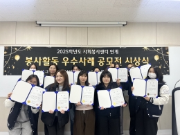 우리 대학 사회봉사센터는 지난 12월 11일, ‘사회봉사센터 연계 봉사활동 우수사례 공모전’ 시상식을 개최했다. 이번 공모전은 봉사활동 경험을 통한 학생들의 성찰과 성장을 격려하고, 지역사회 참여 문화를 확산하기 위해 마련되었다. 공모전은 11월부터 12월까지 한 달간 진행됐으며, 2025년 3월부터 11월까지...